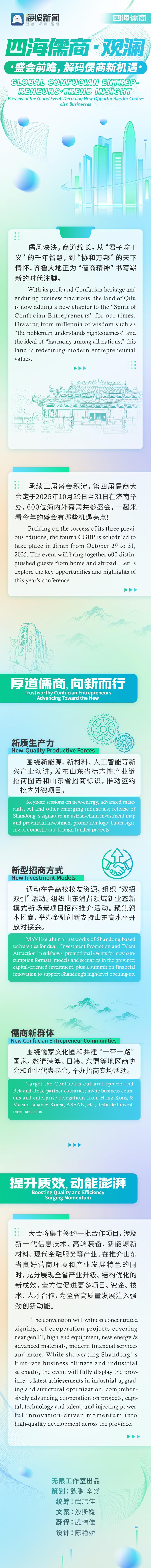 【编者按】“四海儒商”系列国传报道以儒商精神为纽带,跨越文化界限,聚焦第四届儒商大会。随着儒商大会国际化进程的不断深入,越来越多的外商和媒体开始关注、理解和践行儒商理念。该系列作品利用长篇双语照片、采访视频和外媒视角,立体展示儒商文化融入跨国管理的实践及其与儒家企业家故乡山东的深厚联系,打造一场贯通东西方的思想之旅。编者按】“全球儒商”系列国际交流,以儒商精神搭建桥梁,超越文化界限,重点关注第四届CGBP(优秀商业伙伴会议)。随着会议不断全球化,越来越多的国际企业家和媒体专业人士互动、解释和传播儒家商业原则。本系列通过视觉、视频采访和国际媒体视角,多维展示儒家文化如何融入全球管理实践,同时深深扎根于其核心山东。它创造了一个将思想与东方和西方连接起来的动态智力之旅。 Infinity Studio创作策划:魏鹏欣然统筹:吴维嘉文案:沙思源翻译:吴维嘉设计:陈燕娇